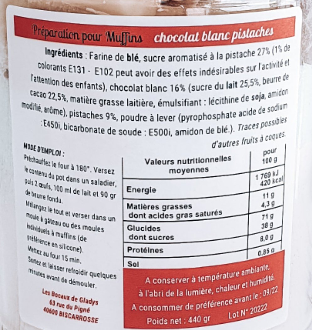 Une recette pour mettre en valeur la pistache ? Ne cherchez plus, vous avez la réponse grâce aux bocaux de Gladys. Voilà le bocal prêt à pâtisser de muffins pistache chocolat blanc.